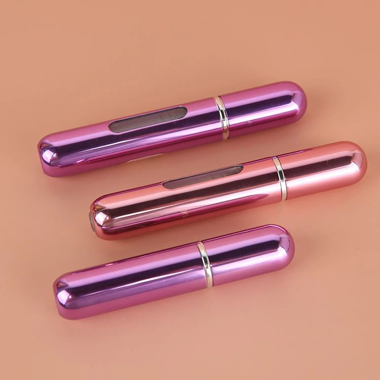 Electro-colored aluminum shells in lilac, rose-gold pink, and violet deliver a mirror sheen without looking flashy. Each tube includes an elongated oval window, lightly frosted to diffuse glare while clearly showing the remaining fragrance. The insert vial is neutral glass to protect scent integrity. The shell shields it from sunlight and bumps, keeping formulas stable on the go.