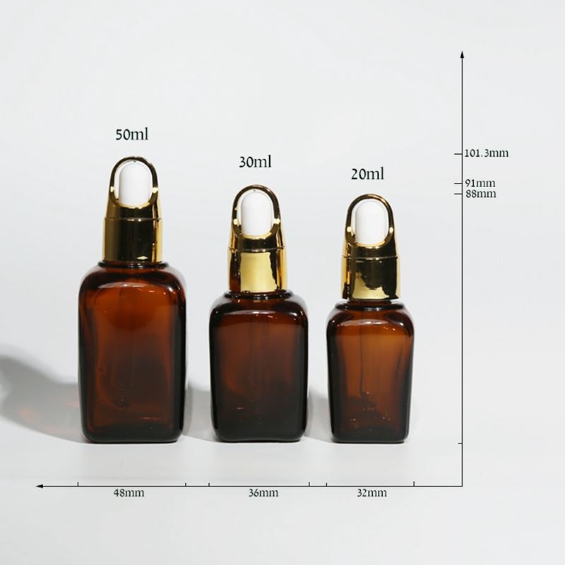 For the design of the 1 oz amber glass dropper bottles, the overall is biased towards a square shape, but it is not so tough and rigid. We also have a slightly curved design on the bottle. The size of the bottle is L 32 × W 32 × H 88mm, the weight of the 1 oz amber glass dropper bottles of this size is 46.3g, and the net content is 20ml. Of course, we also have larger designs that can meet your diverse needs.