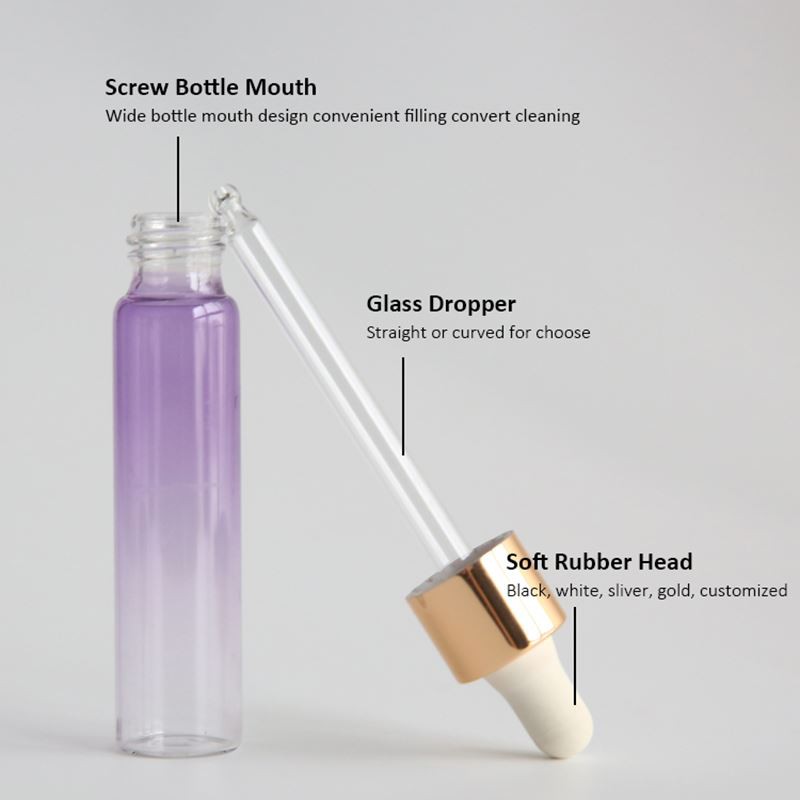 The color design of this clear essential oil dropper bottles is a lavender gradient, inspired by the most famous lavender landscape in Provence in southern France. The lavender field under the setting sun, the purple flower field is shining and breathtaking. We got the enjoyment of beauty from this beautiful natural landscape and tried to keep it and reproduce it in our works. So we use a yellowish purple gradient color as the color of the whole bottle, and we designed the rubber dropper head to be white, making the overall tone more harmonious and gentle, just like lavender gently swaying in the breeze, even with air They all have a romantic atmosphere.