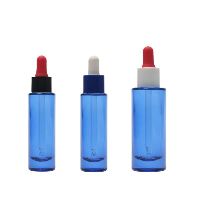 The overall design concept of this series of 1 oz eye dropper bottles is special and rigid. The designer uses slender and straight lines to decorate the bottle body, and uses transparent dark blue as the overall color of the bottle body.