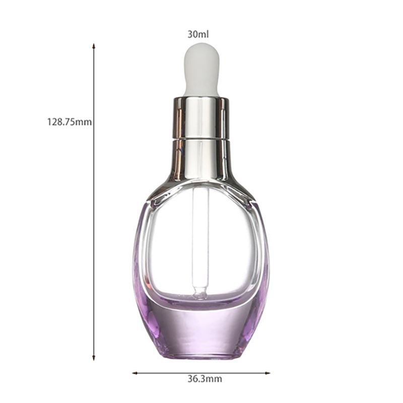 The size of this series of the 30ml sample dropper bottles is L 58.1mm × W 36.3mm × H 128.75mm, weighs 150g, and has a net content of 30ml. For this series, we not only made a smooth arc shape, but also made a narrow bottle shape to meet your different needs. The choice of color is also diversified, especially the color design at the bottom, which allows the liquid contained in it to refract more light.